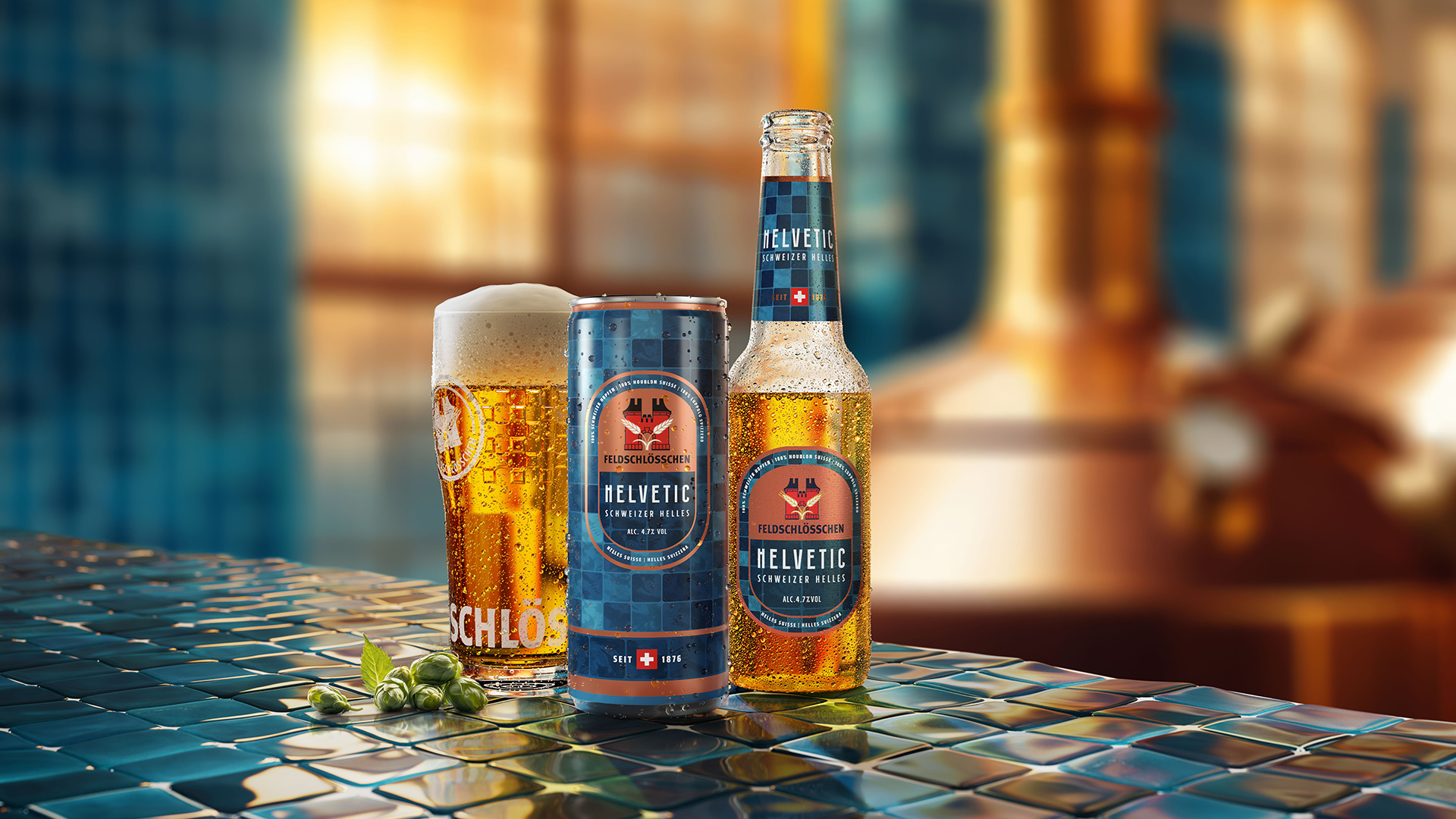 Die optische Gestaltung der beiden Gebinde ist inspiriert vom Entstehungsort aller Feldschlösschen-Biere: dem Sudhaus. Die blaugrünen Kacheln sowie die Kupferfarbe der Sudpfannen finden sich auf Dosen, Flaschen und Verpackungen wieder.
