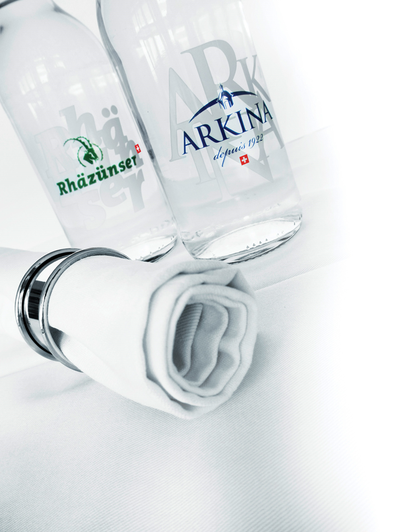 Swiss Premium Selection: Arkina et Rhäzünser sont proposées en bouteilles haut de gamme (40 et 80 cl) avec bouchon à vis aluminium de haute qualité pour une présentation raffinée à table.